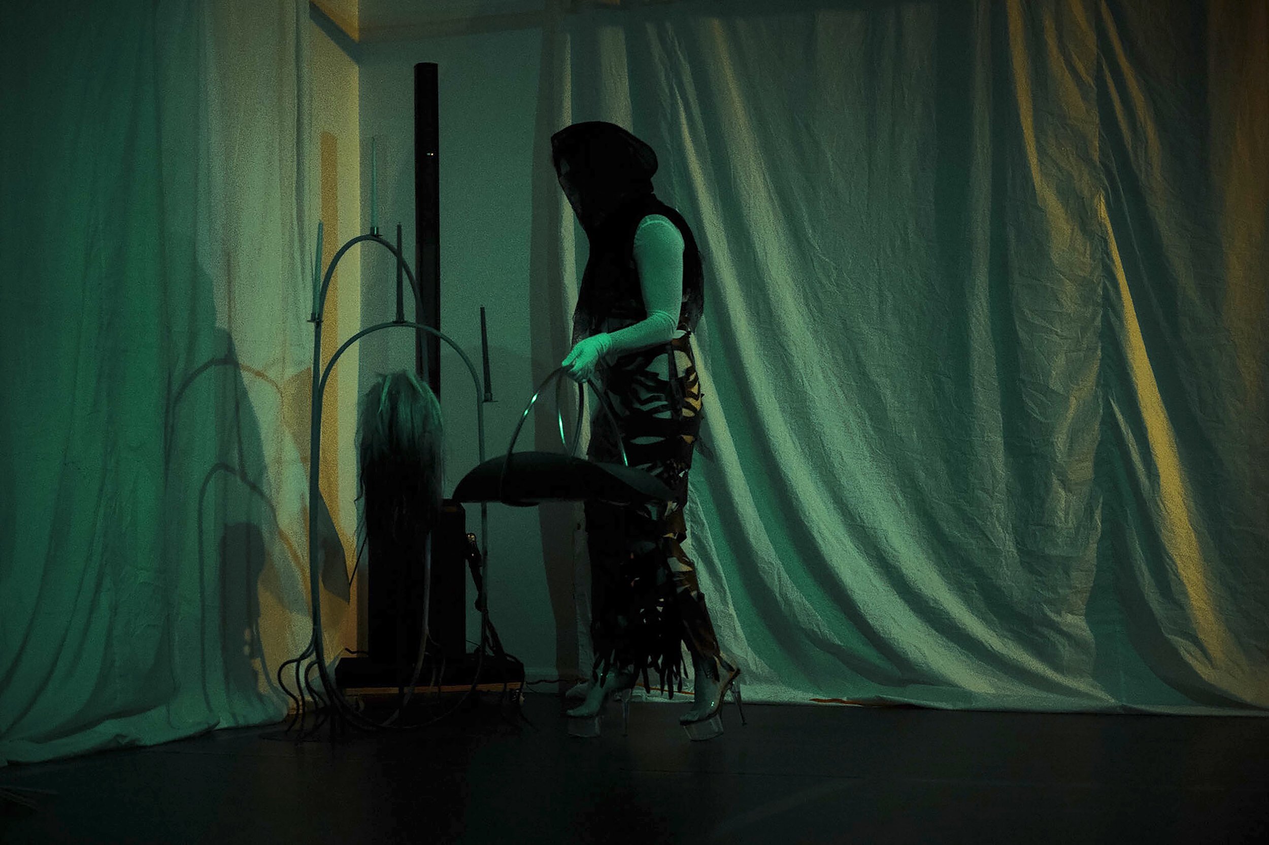 This performance evolved from the Summer Solstice Performance for Three Wigs, 2023 and stems from a series of four handmade wigs with realistic silicone elements—lettuces, carrots, red snapper, and peppers.